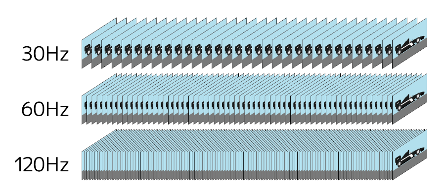 Hzの数は1秒間に何枚の画像が切り替わるかを表している。30Hzだったら1秒間に30枚の画像、120Hzだったら1秒間に120枚の画像が切り替わるのだ。